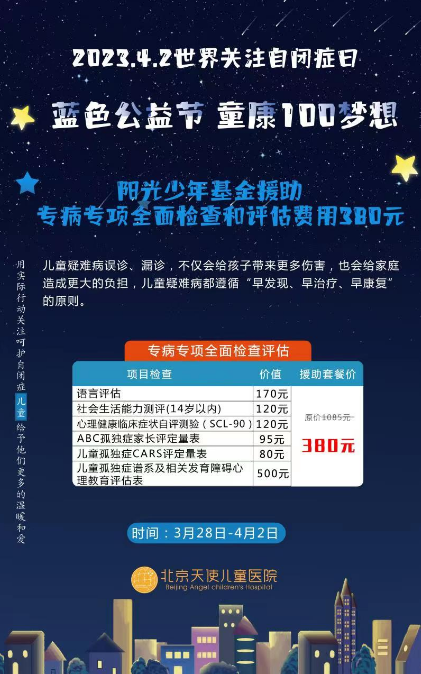 自闭症迄今为止病因未明,为患儿家庭和社会带来严重经济和精神负担,北京天使儿童医院在蓝色公益节期间免预约挂号,针对自闭症、语言发育迟缓的患者,全面检查和评估费用优惠至380元,并且可向阳光少年基金申请“儿童健康成长补助”(30%),离院结算后,凭相关材料向基金申请补助7日左右拨付至个人账户。