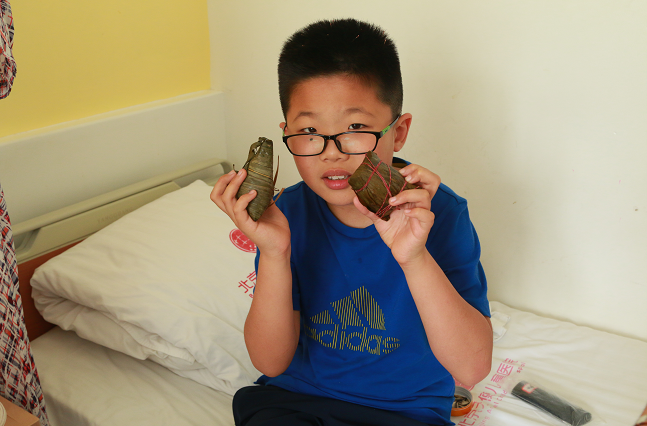 王东记主任刚刚接诊完一位患儿,稍作休息便赶来带领着医护人员,把热腾腾、新出锅的粽子送到患儿的床前,和患儿及家长们一起过端午节。送去温馨的祝福的同时,还细心叮嘱患儿们吃粽子时的注意事项。当医护人员正把一个个裹满祝福的粽子,送到家长手中,家长们或是惊讶,或是微笑,微变的神情中,无不表露出自己的感动,他们说:" 没想到,在医院还能过上端午节!"