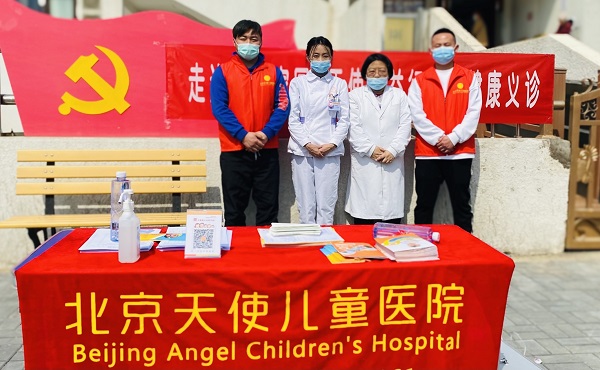 北京天使儿童医院医护人员提前准备好桌椅、登记本、检查物品等,为现场的儿童免费测身高、测体重、预测成年身高,并普及生长发育科普小知识。