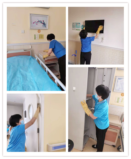 每天为保持我院的良好卫生环境默默无闻的尽一份力,在这平凡之中蕴藏着无私与奉献 。 她们不怕苦 、不怕累 、把医院的每一个地方都打扫的干干净净,从不放过一处角落,从不落下一丝灰尘,没有死角,这是勤劳伟大的保洁阿姨辛勤劳动的结晶。