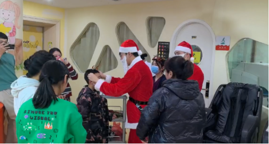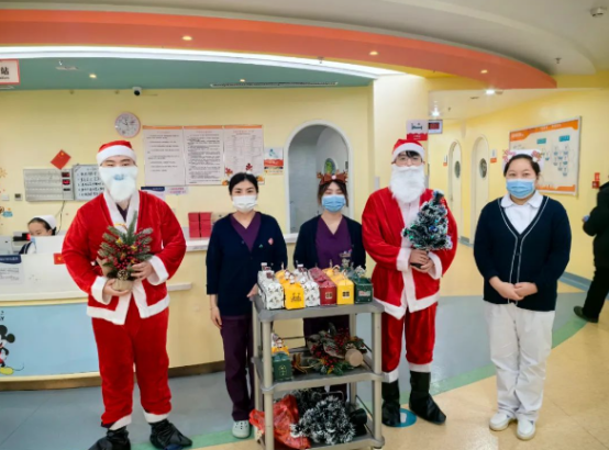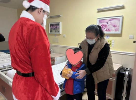 像童话故事里一样,由工作人员化身的圣诞老人,拎着他的礼物车,拿着圣诞小树,穿梭在医院各个角落,让每位小朋友都能感受到节日的快乐氛围、带来的暖意。